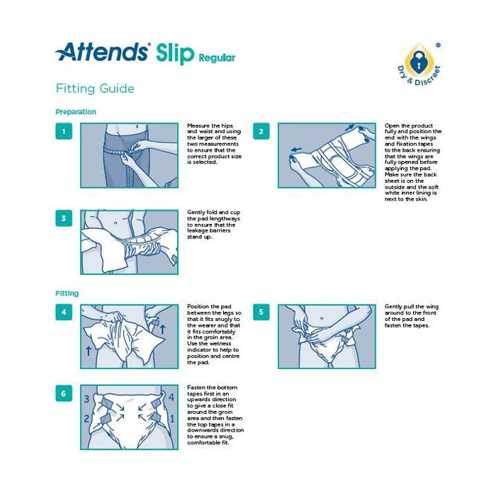 The Attends Slip Regular (9) All in Ones are designed for heavy to severe levels of urinary and faecal incontinence, ideal for users who have little or no control over their bladder or bowel function. These All in Ones feature high level security with built-in leakage barriers and a Quick Dry® absorbent zone which keeps liquid away from the surface, the skin dry and the user comfortable. With the ability to withstand several gushes this product is extremely cost-effective and can be used throughout the day.In the event of an accident, these All in Ones also have an odour protection system which locks away and masks foul smells. These products also feature a wetness indicator which acts as a guide, notifying the user when they should be changed.The Attends Slip Regular (9) are designed to fit the user’s body and have 4 fixation tapes that make the product easy to fit, comfortable and very secure, they also have breathable non-woven wings that encourage air flow and promote greater skin health.