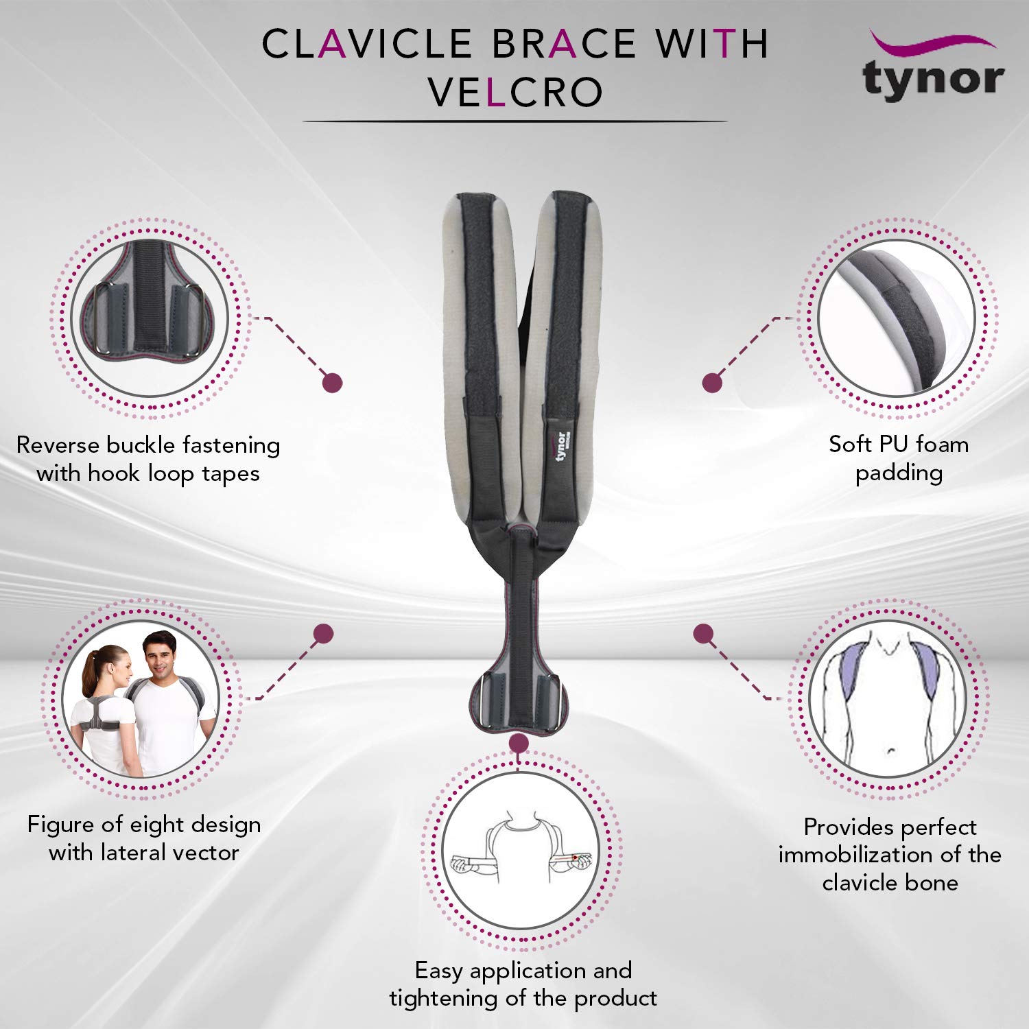 - Figure of eight design with lateral vector ensures linear union of the clavicle bone, allows the required movement of the arms with perfect immobilization of the clavicle bone, easy application and tightening of the product