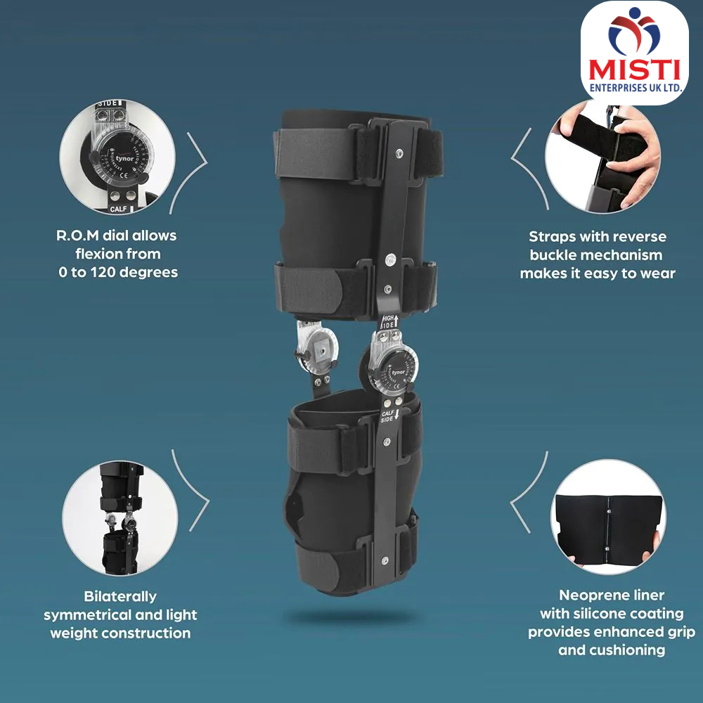 - Range of Motion from 0 to 120 degree flexion and 0 to 60 hyper extension with locking intervals at 15 degrees.