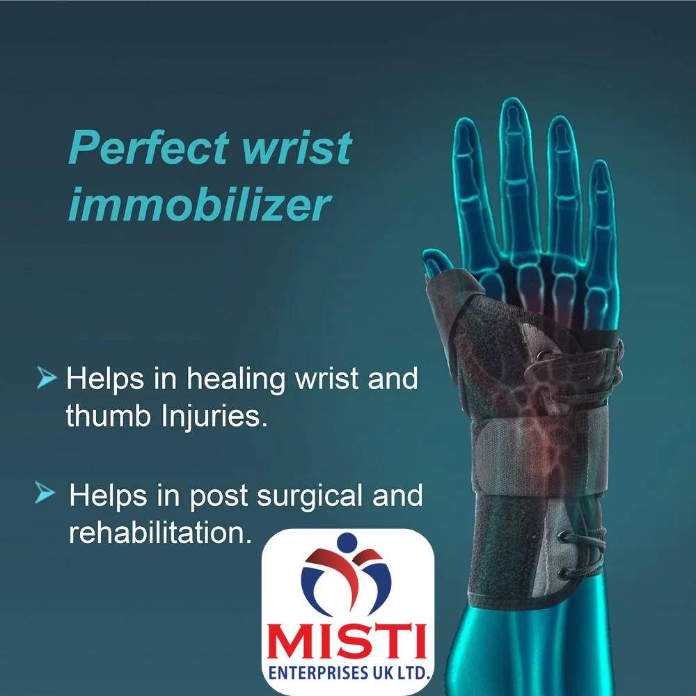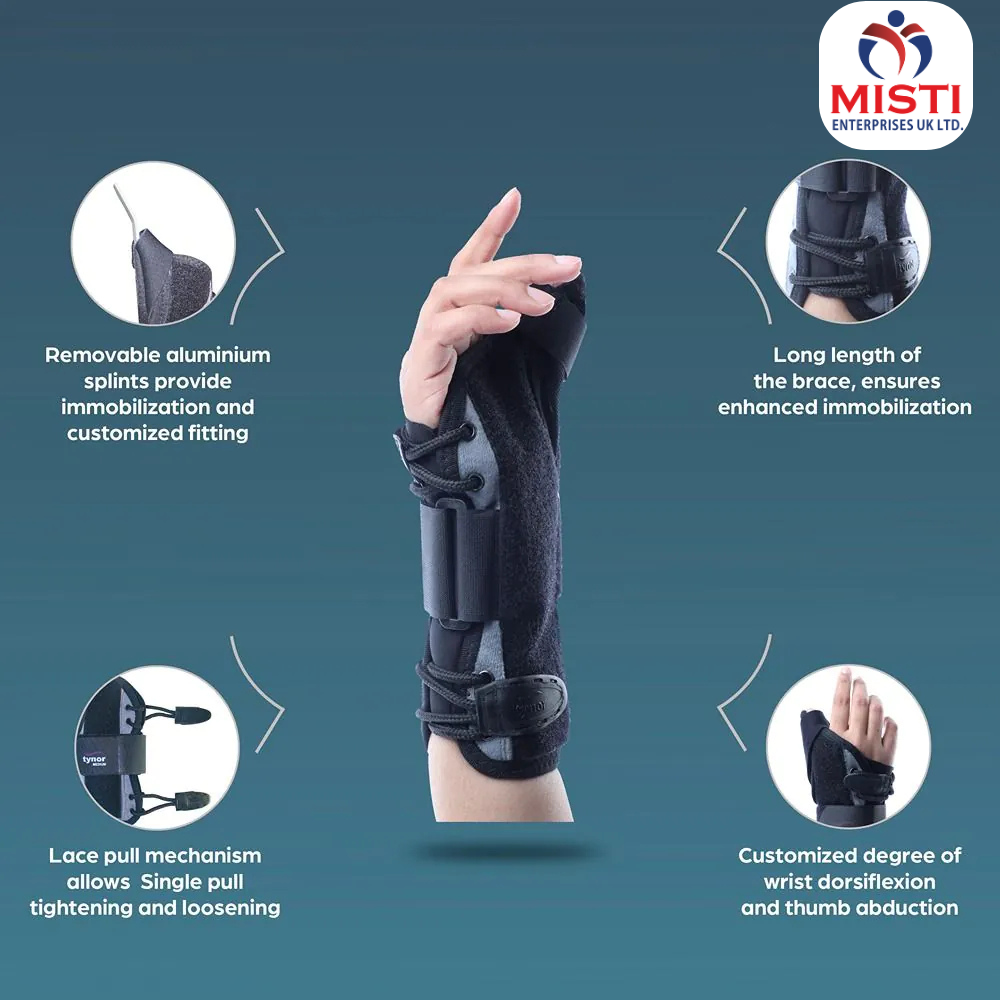 An ideal brace for conditions where immobilization of the wrist and thumb is required. The wrist can be maintained in the dorsiflexion and the thumb in abduction. *Use this product under the guidance of a qualified doctor.